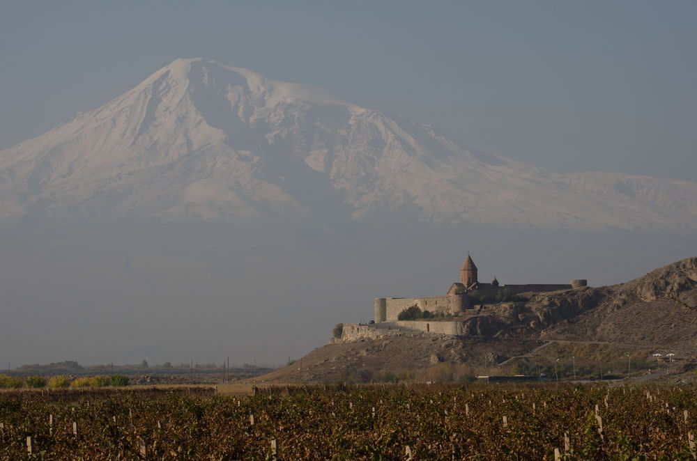 Figura 5. El monte Ararat visto desde territorio armenio con el monasterio de Khor Virap en primer plano |
