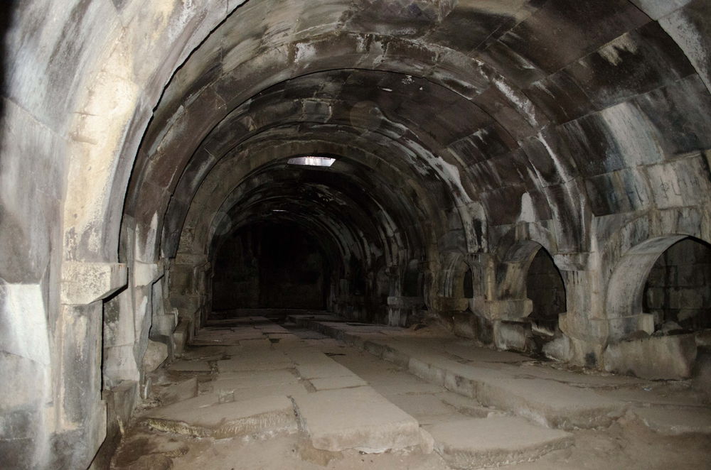 Volviendo a tiempos más recientes pero también de siglos pasados, visitamos un interesante caravasar, uno de esos alojamientos que usaban las caravanas para refugiarse y descansar durante los largos periplos que tenían que realizar por motivos comerciales, militares o religiosos Muchos de estos edificios pueden verse en Irán, en Siria, en Uzbekistán, en Turquía y en otros países, pero en general han sido restaurados y convertidos en comercios o centros turísticos por lo que es muy difícil imaginarse cómo eran realmente. Este que visitamos en el centro de Armenia es un sólido y bonito edificio de piedra, a la vez muy cerrado y sombrío, con arcadas en los flancos para el descando de los caravaneros. Un lugar idóneo para guarecerse del frío y pasar la noche al amparo de la lluvia y de los vientos. Un refugio tan simple y rústico como imprescindible y sólido (figura 9).