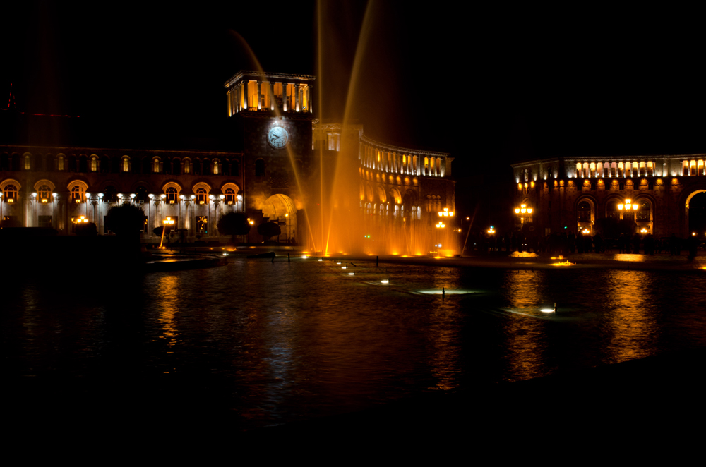 Nuestro recorrido por Armenia nos llevó a otros lugares como el balneario de Jermuk, la iglesia de Ashtarak, los altiplanos que rodean al monte Aragats, hoy el más alto del país con más de 4.000 m de altitud, la visita a un poblado de montaña habitado por población de origen ruso, etc. Baste, sin embargo, lo aquí dicho para tener una idea, siquiera aproximada, de la enorme riqueza cultural que atesora este pequeño país que conserva con empeño su identidad nacional a pesar de que aproximadamente el 70% de los armenios viven en la diáspora. Nos despedimos pues de Armenia con una imagen nocturna de la plaza de la Constitución, núcleo central de la capital, Ereván (figura 18).